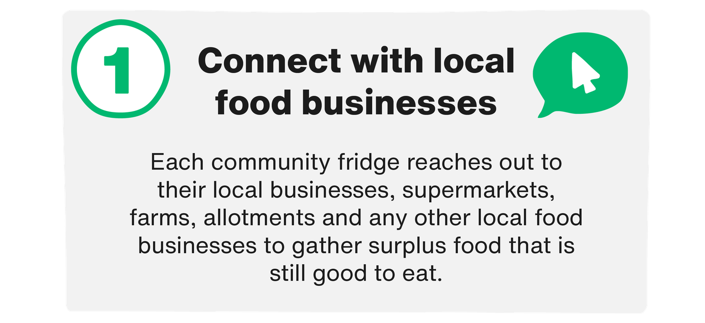 Find out if there's food going to waste in your area that a fridge could use. Local farms, allotment associations, food producers, cafes, hotels, and food shops might have perfectly good food that they just can't use. Online platforms like Caboodle, Neighbourly, and Foodiverse can also help liaise with supermarkets to procure surplus food.