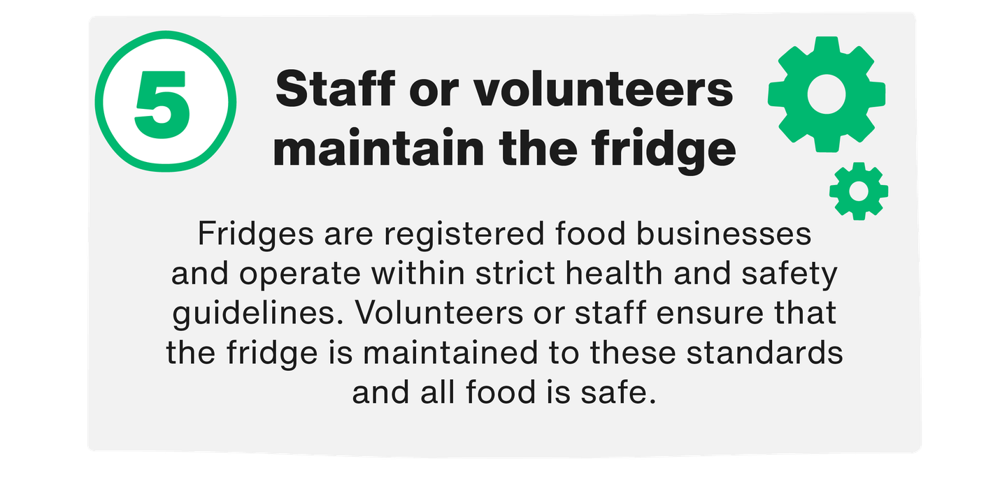 Setting up a fridge means doing some legal stuff. It’s only possible to do this as an official community group or charity rather than trying to do so on your own. This way, you can get registered as a food business, get public liability insurance and even a bank account to manage your funds.